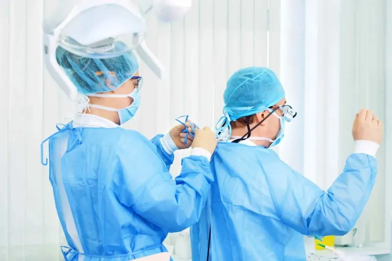 پیش از ورود به اتاق جراحی، اطمینان حاصل کنید که پیشبندها به طور درست و کامل پوشیده شده اند و هیچ ناحیه ای از بدن بدون پوشش باقی نمی ماند.